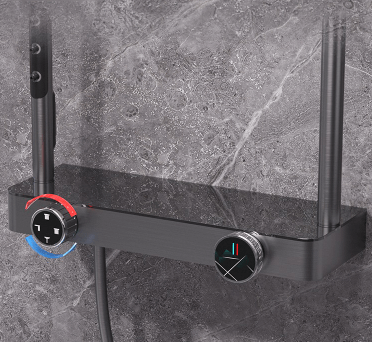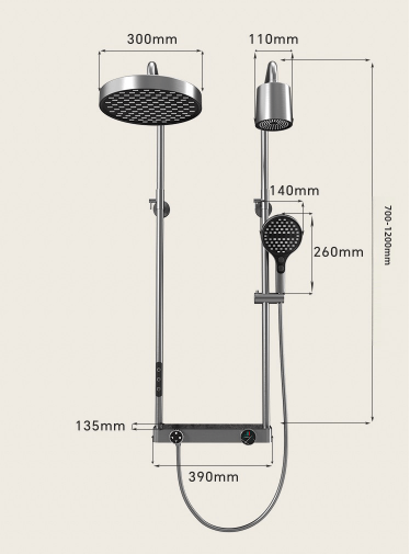 Zostava obsahuje dve hlavice – veľkú dažďovú sprchu na vrchu a ručnú sprchu po strane. Celkovú výšku nastavíš podľa potreby v rozsahu 90 až 100 cm, aby vyhovovala tvojej postave. Teplotu a výber výtoku reguluješ cez dve samostatné kolieska s prehľadným označením.