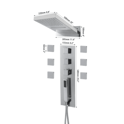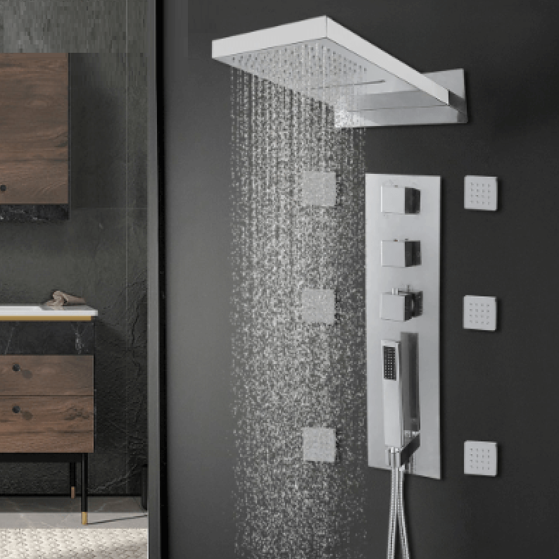 Panel disponuje štyrmi rôznymi výstupmi vody – hornou dažďovou sprchou, šiestimi telesnými tryskami na masáž celého tela, ručne ovládanou sprchou a vodopádovým prúdom. Všetko ovládate intuitívnymi otočnými regulátormi, ktoré presne nastavujú teplotu a režim vody. Telesné trysky ponúkajú jemnú masáž a prispievajú k lepšiemu uvoľneniu po náročnom dni.